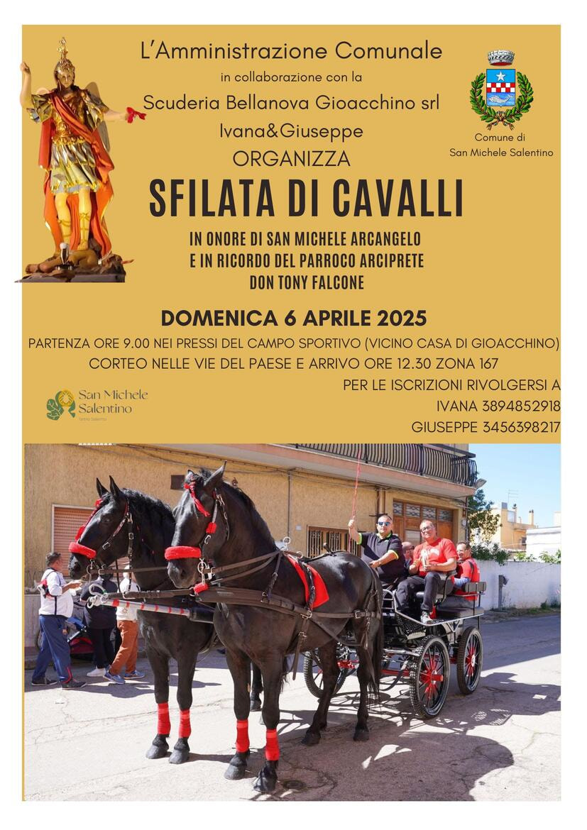 Domenica 6 aprile, in collaborazione con la Scuderia Bellanova Gioacchino Srl, organizza la tradizionale sfilata di cavalli in onore di San Michele Arcangelo, dedicata quest’anno anche alla memoria del Parroco Arciprete don Tony Falcone.L’evento inizierà alle 9:00 presso il Campo Sportivo, vicino alla dimora di Gioacchino.