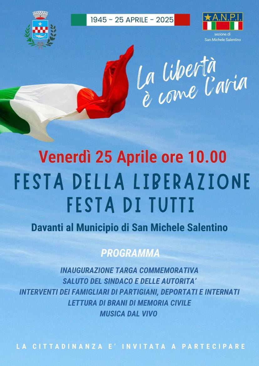 Venerdì 25 aprile alle ore 10.00, davanti al Municipio, San Michele Salentino ricorderà l’Anniversario della Festa della Liberazione – Festa di tutti - con una cerimonia ufficiale.In occasione degli ottant’anni dalla fine della dittatura e della guerra, l’Amministrazione Comunale e la sezione locale dell’A.N.P.I. hanno promosso la posa di una targa commemorativa sulla facciata dell’edificio comunale che si affaccia su piazzetta San Giovanni Paolo II.Parteciperanno le autorità civili, militari e religiose, insieme alle famiglie dei partigiani, dei deportati e degli internati di San Michele Salentino. Sarà un momento di memoria condivisa e di gratitudine verso chi ha lottato per la libertà e la nascita della nostra democrazia.