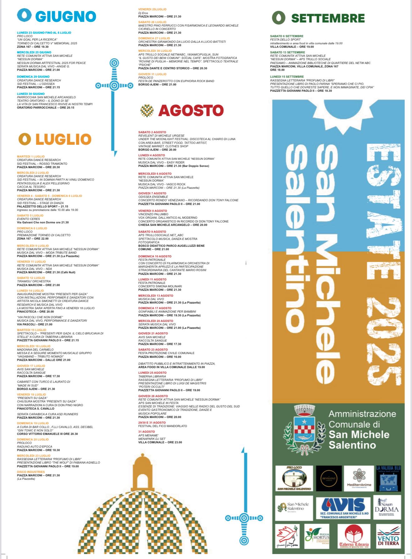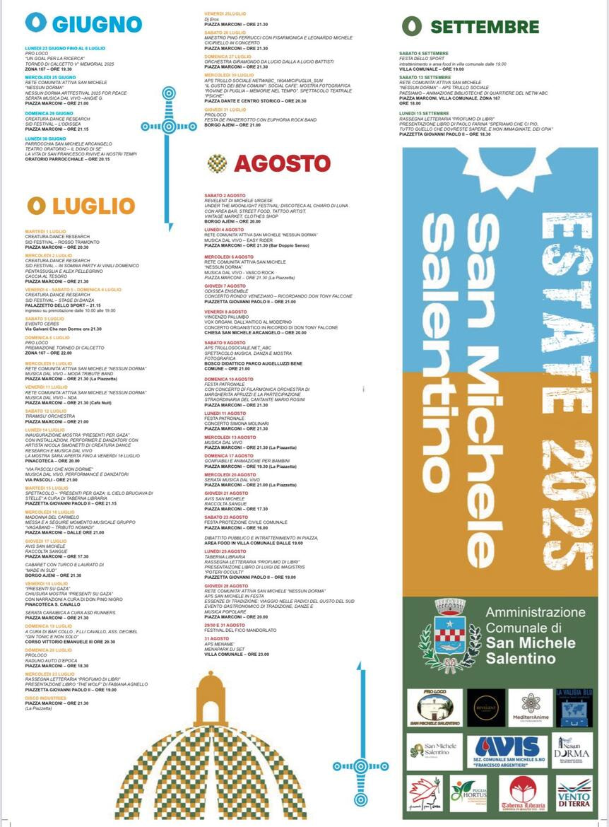 A San Michele Salentino lโestate profuma di cultura e diventa la cifra autentica di una comunitร unita. Il programma ricco di eventi, sostenuto fattivamente dal Comune, รจ unโonda che abbraccia il paese con musica, danza, teatro, sport, libri, memoria e condivisione.